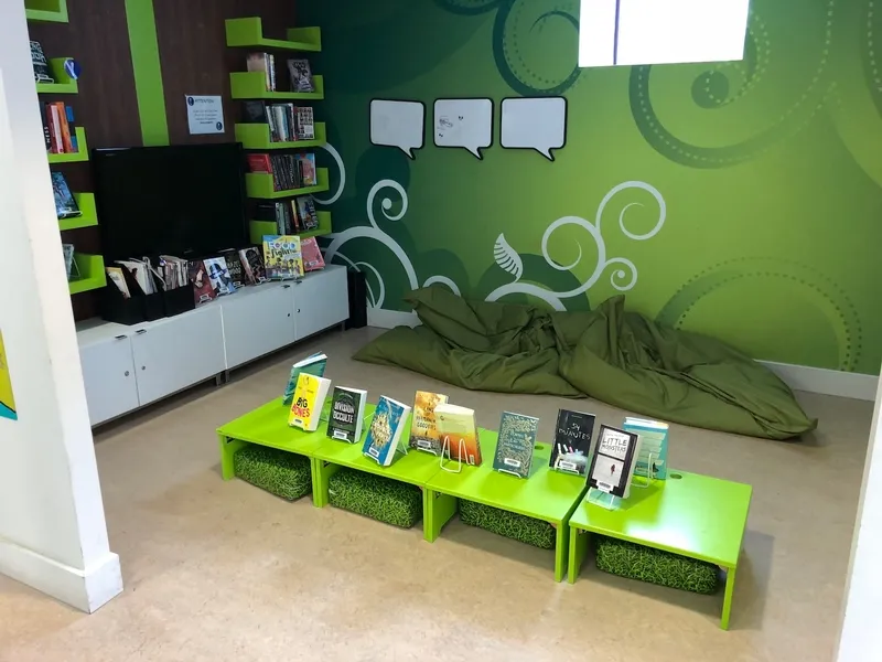 Collection of large print books, audio books, braille/relief books, DVDs/Blu-rays with subtitles and audio description.