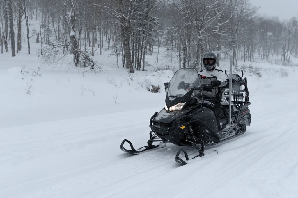 - Bruno-Alexandre rode a snowmobile down wooden trails in the Québec City area. Helped by a staff member, this big, sturdy fellow transferred himself onto a skidoo, where an adjustable backrest held him in place. Watch him speed off under this beautiful January snowfall while safe and in control of his vehicle.