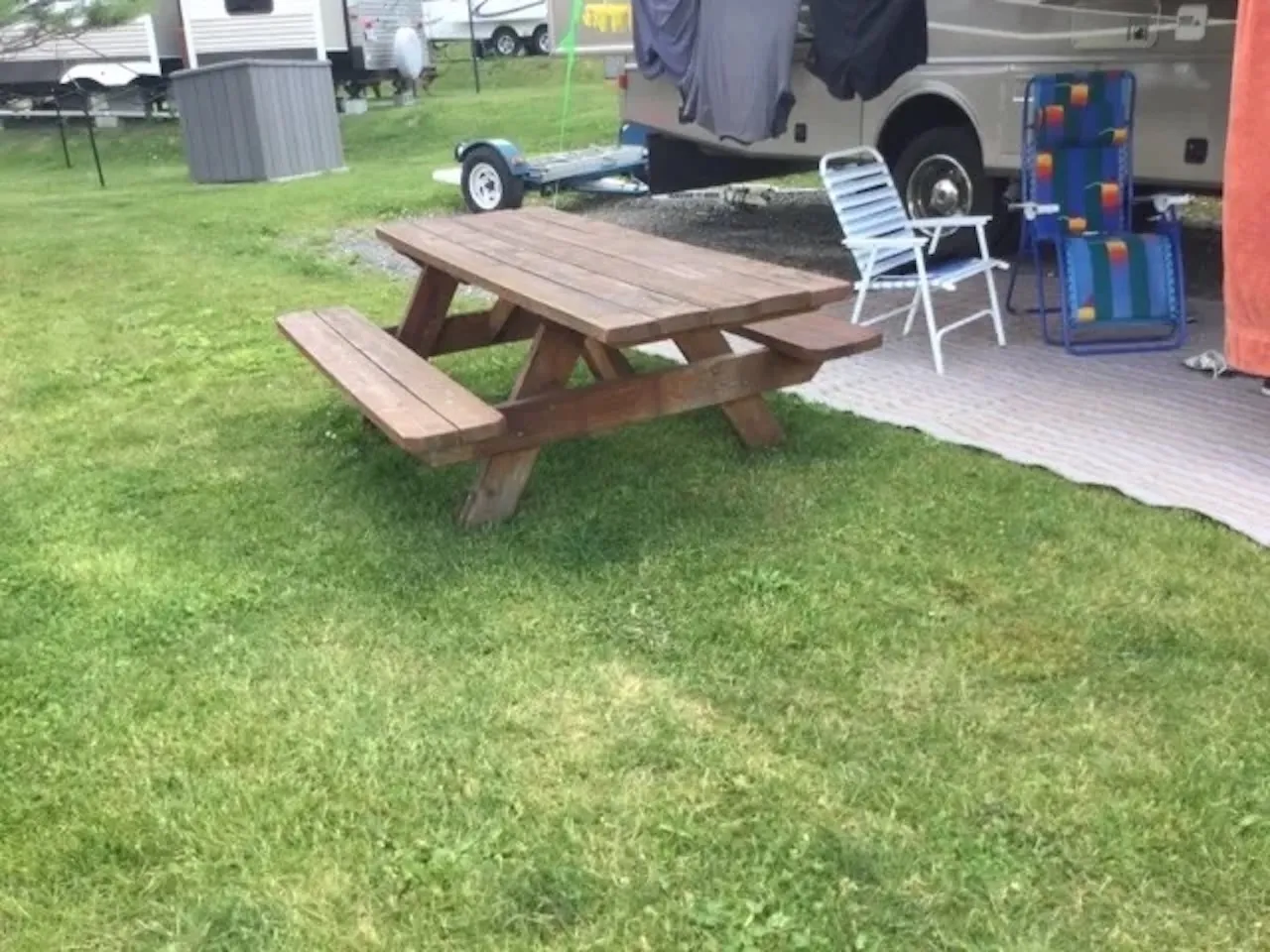Table à pique-nique aménagée pour les personnes handicapées disponible. Prise d'électricité et robinet d'eau sur le site positionnés à une hauteur entre 40 cm et 120 cm.