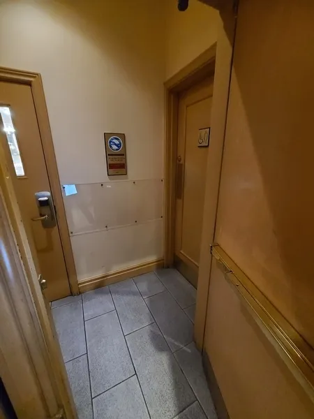 Manque de signalisation sur la première porte menant à la toilette accessible.